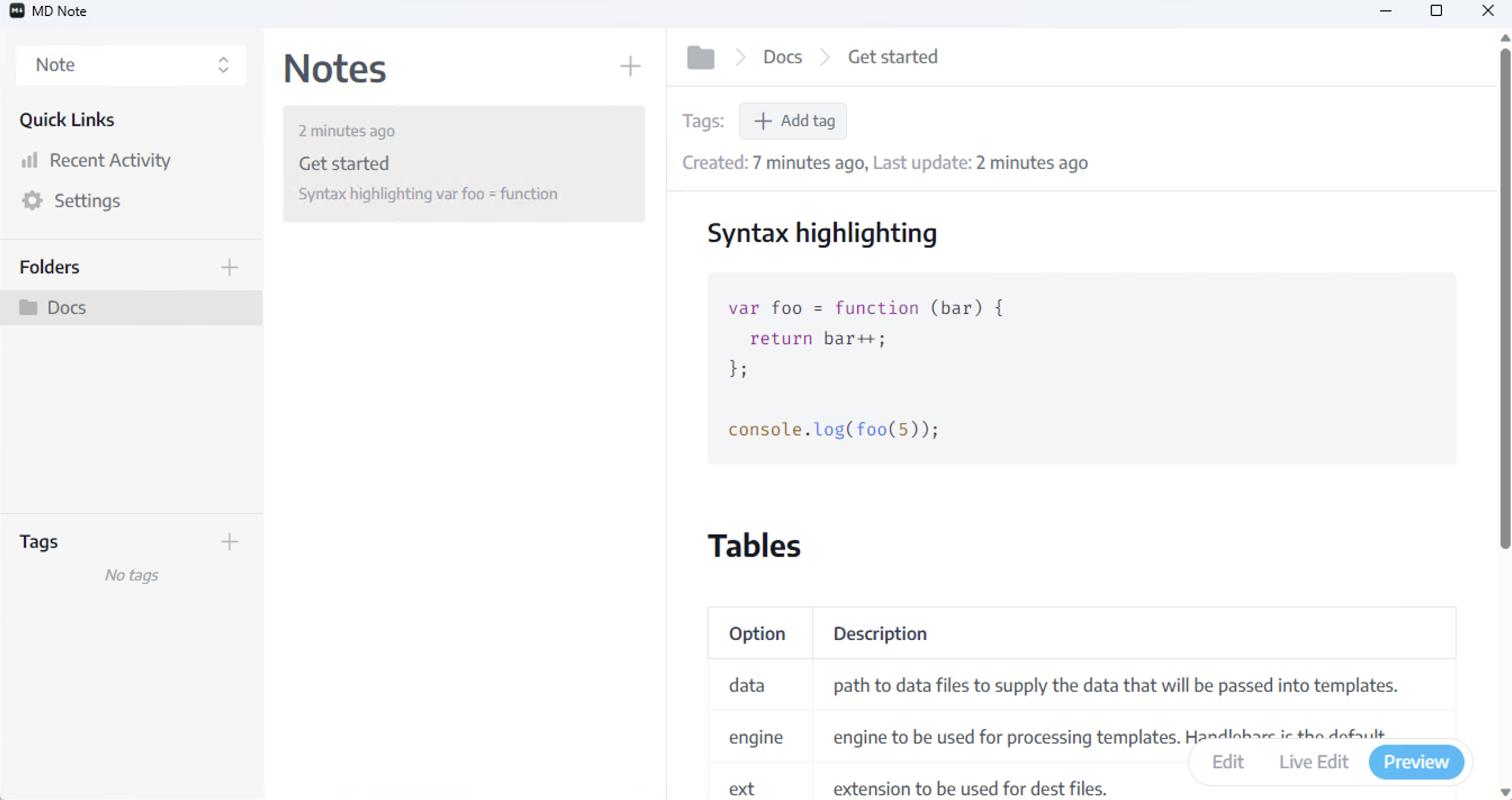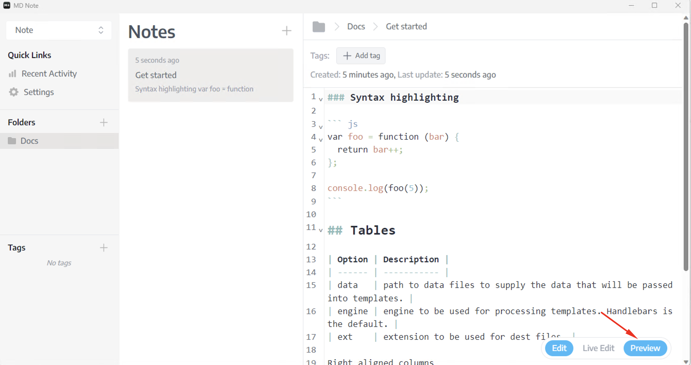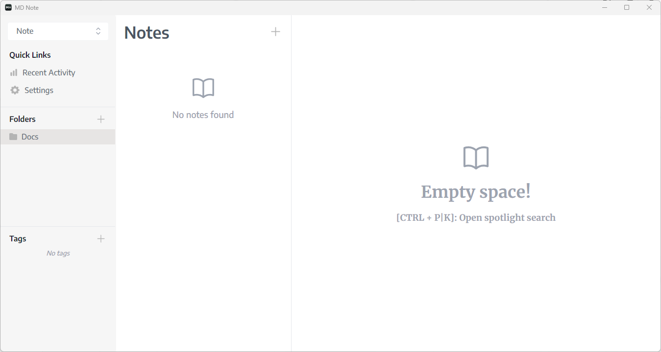 You need a folder to create the note. So, click the + icon right side of Folders, Then give a name and hit enter