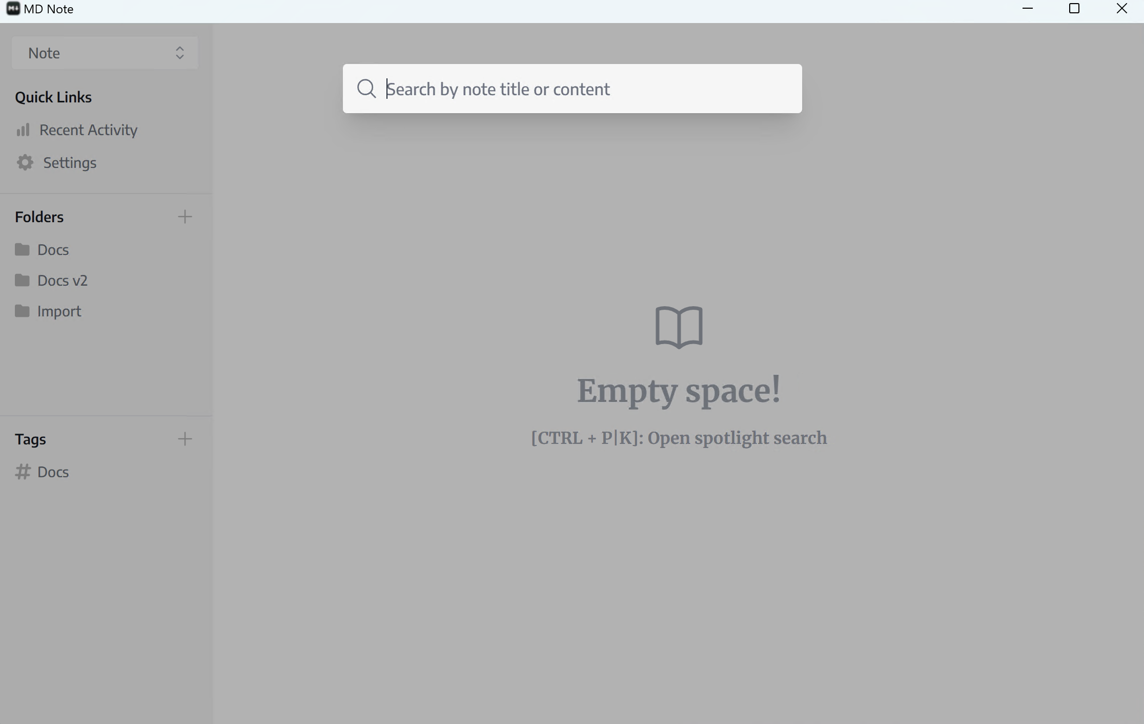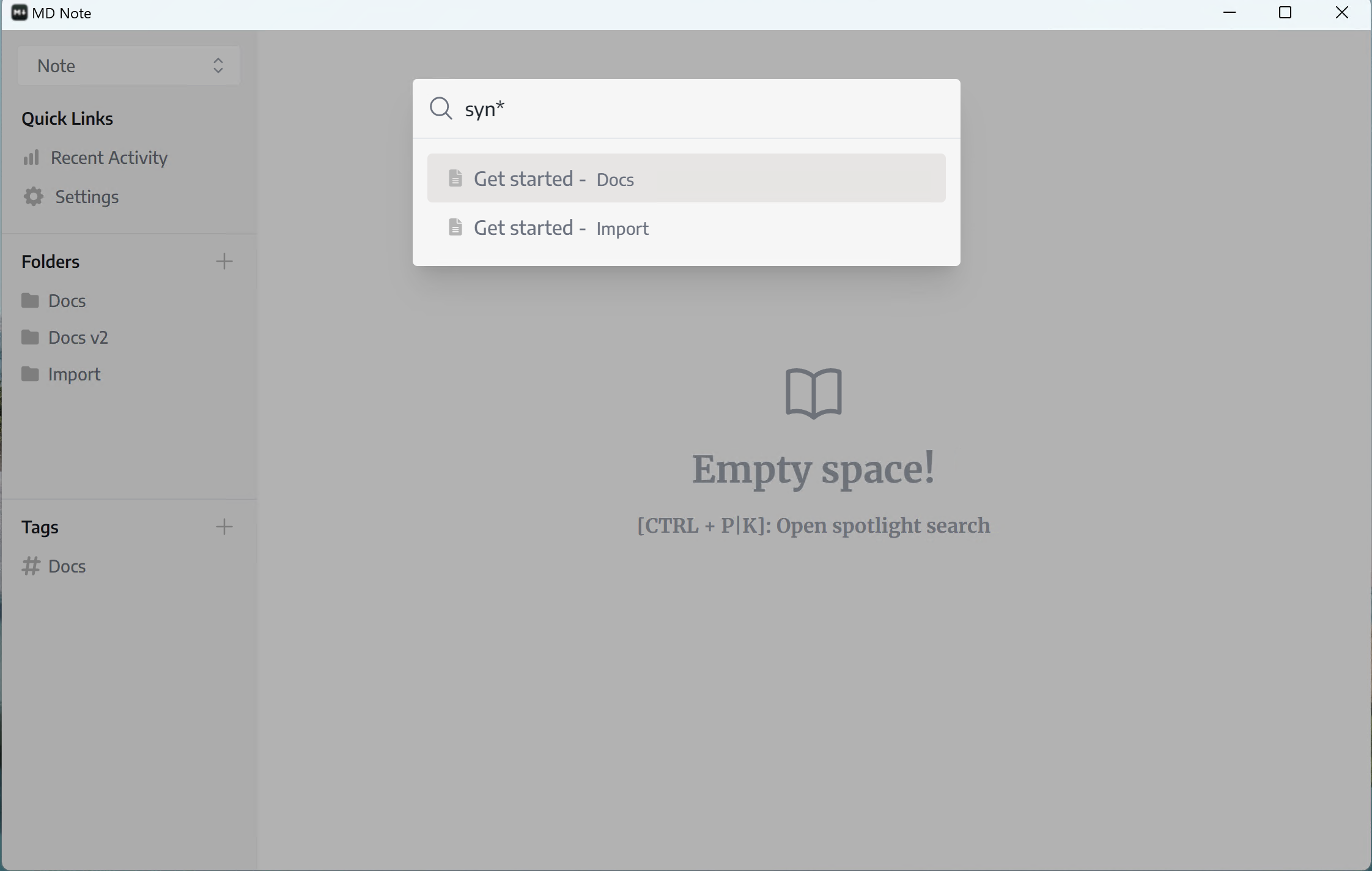 Pressing Ctrl+P or Ctrl+K will be activated spotlight search. You can search by note's title or content using full text search syntax Check out those following links